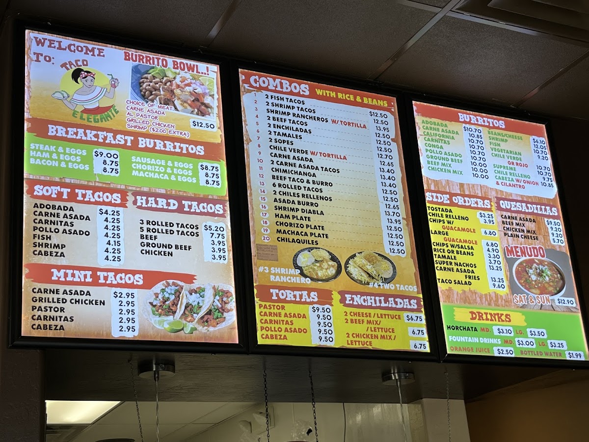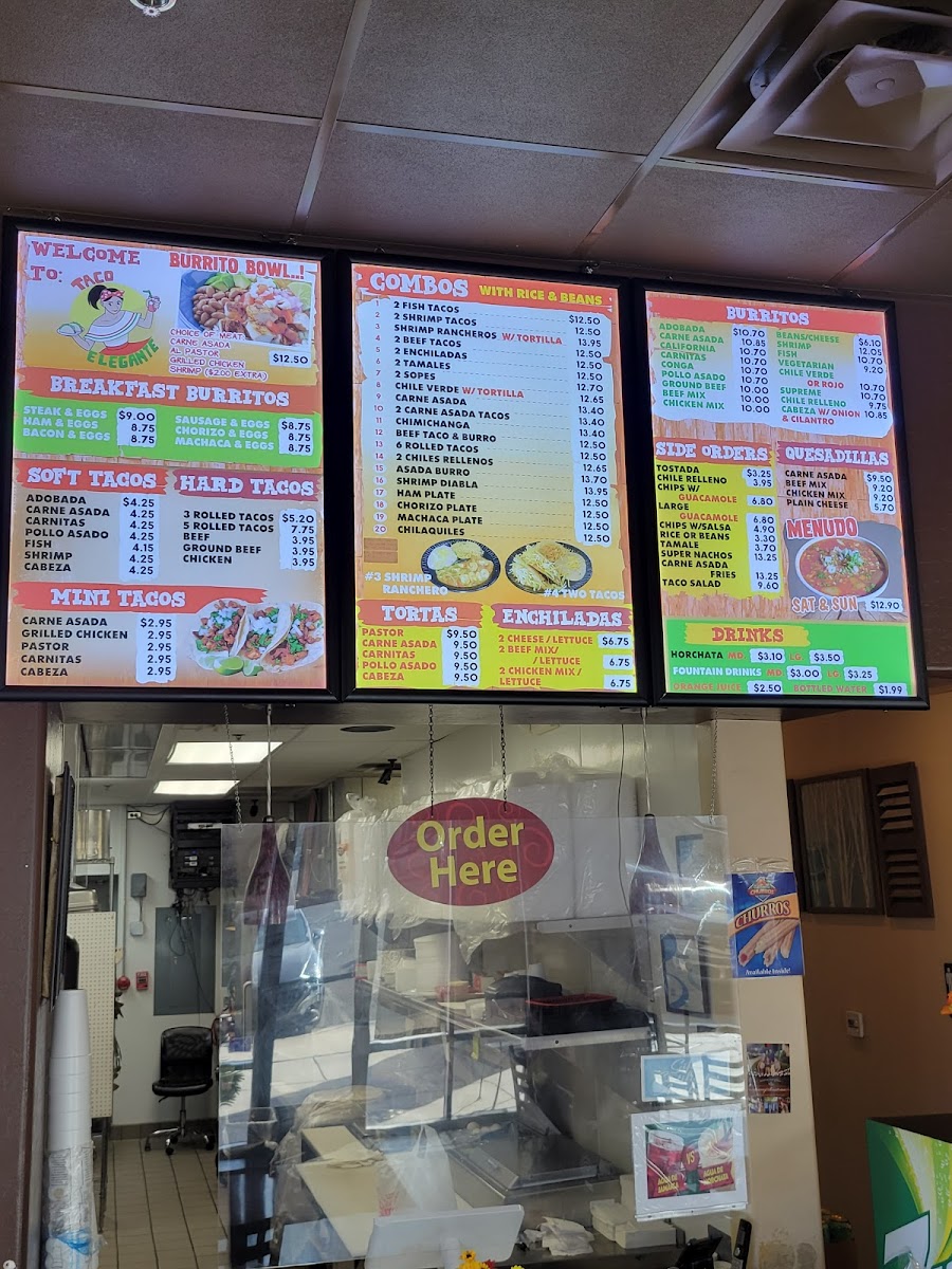 Taco Elegante offers a diverse menu full of flavorful Mexican dishes, catering to various tastes. For a hearty start, try the Burrito Bowl or the variety of Breakfast Burritos like the Steak and Eggs Burrito or Chorizo and Eggs Burrito. The Soft Tacos section features mouthwatering choices such as Adobada Taco, Carne Asada Taco, and Pollo Asado Taco, while the Hard Tacos provide options like the Beef Taco and Chicken Taco, with both 3- or 5-piece servings of Rolled Tacos. Mini tacos are also available, including Carne Asada Mini Taco and Grilled Chicken Mini Taco. For a complete meal, the Combos like the Fish Tacos Combo or Beef Tacos Combo are ideal. Don't miss the Tortas, such as the savory Pastor Torta and the robust Carne Asada Torta. Classic Enchiladas, including the Cheese Enchiladas or Beef Enchiladas, are always a favorite, alongside substantial Burritos like the Carne Asada Burrito or the indulgent California Burrito. For side dishes, options like Chips with Guacamole and Chile Relleno add to the variety, while the Quesadillas such as the Carne Asada Quesadilla and Chicken Quesadilla are perfect for a quick bite. To complement the meal, try a refreshing Horchata or a Fountain Drink. Finally, end your meal with a sweet treat like a Plain Churro or the indulgent Churro Cream. With such a wide range of delicious options, Taco Elegante is a great spot for both quick bites and full meals.